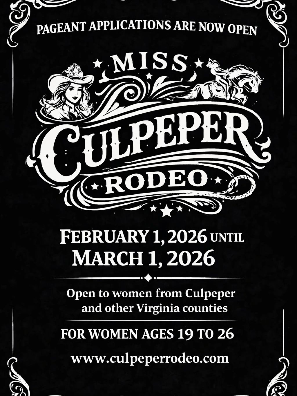 Miss Culpeper rodeo Pageant. Open to young women in Culpeper and other Virginia counties. The competition celebrates leadership in the community, self-confidence, self image, and a passion in horsemanship.